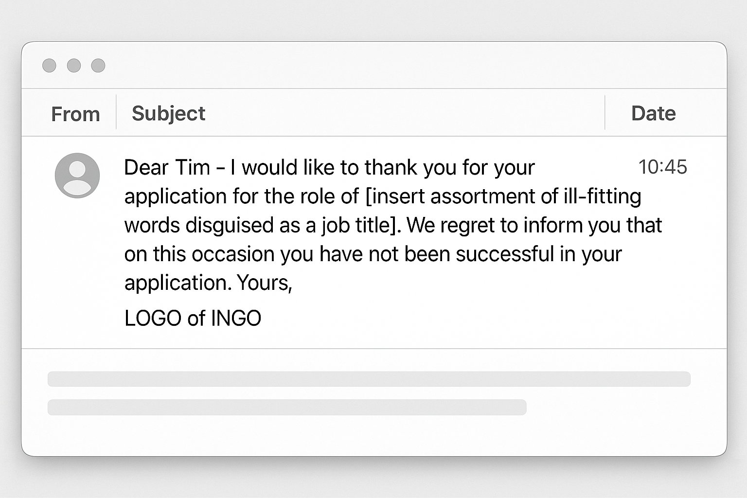 The email above is verbatim from an INGO that rejected me for a “Head of” position. I get emails like these a lot and am comfortable sharing that. It was a rather whimsical application to be fair, given the last six years I’ve been in the market for short term consultancies rather than full-time roles.